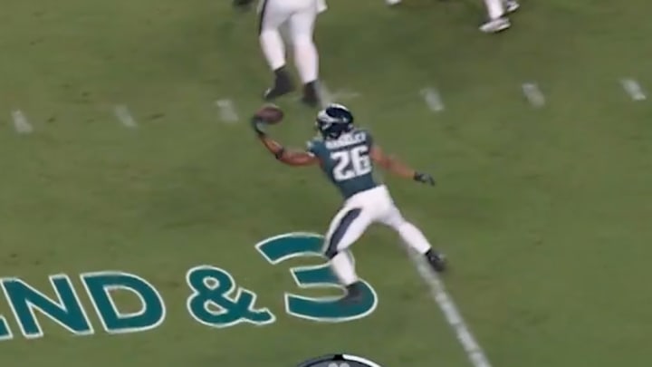 While Barkley found the end zone earlier in the game, his most jaw-dropping highlight came on a simple five-yard gain that showcased every bit of his superstar skillset.